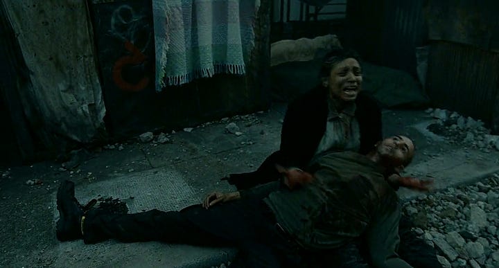 Here’s an example. In the scene where Theo and Kee leave the Russian apartments, he says, “The next shot you see is this woman wailing, holding the body of her son in her arms. This was a reference to a real photograph of a woman holding the body of her son in the Balkans, crying with the corpse of her son. It’s very obvious that when the photographer captured that photograph, he was referencing La Pieta, the Michelangelo sculpture of Mary holding the corpse of Jesus.