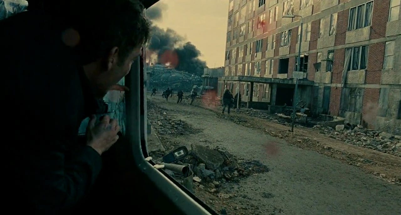 One such incident included the opening scene in which a terrorist bomb goes off on Fleet Street and nearly kills Theo. A few weeks before cameras rolled, real-life Islamist radicals detonated four bombs across London on July 7, 2005. Fifty-two people were killed, another eight hundred left wounded. It was with great reluctance that the government let them film the scene10, but they’d only get a day to shoot it. Cuarón, though, refused to shoot it because the cars hired looked new. For his dystopia, he needed them to be worn out and damaged.
