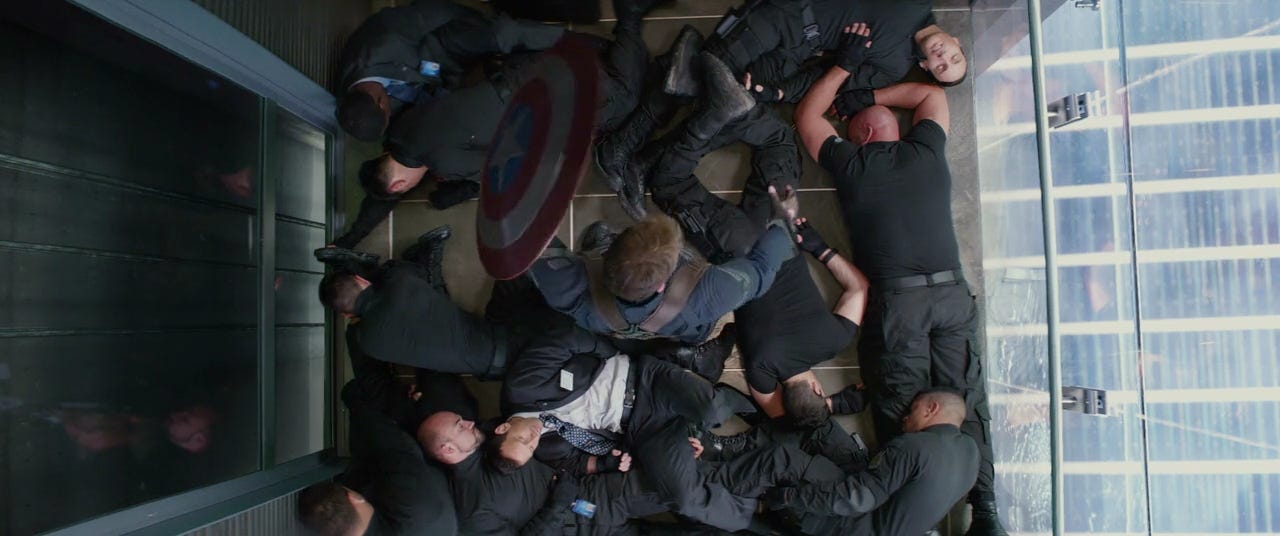 For the elevator fight, “the Russos and the Marvel visual staff developed an extensive collection of storyboards and montages, dictating the overall look and key shots.” James Young, the fight choreographer (and Sebastian Stan’s stunt double), studied the portfolio carefully and trained his team of stuntmen, filming it with a consumer-grade camera or a cellphone to show the brothers, who’d point out what they liked or what they wanted to modify in the next pass. Once the choreography was approved, Young and his team then taught the actors. Evans had to do most of the choreo himself; the confined quarters made it difficult to swap in a stunt double without it being obvious.