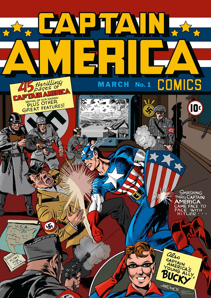 Captain America made his debut on 20 December 1940 in the pages of Timely Comics’ Captain America Comics #14. Created by Joe Simon and Jack Kirby, the cover became instantly iconic for famously depicting the super soldier punching Adolf Hitler in the jaw5.