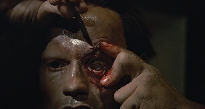 A trickier scene involved showcasing the metal endoskeleton underneath the Terminator’s flesh, which occurs in a motel bathroom. Winston used silicone, plaster, and clay to sculpt a lifelike reproduction of Schwarzenegger’s face in various poses. One particular squeamish moment called on the actor to seemingly slice through his damaged eye with a scalpel, an image that paid homage to Luis Buñuel’s Un Chien Andalou. This is not an accident; while Cameron’s sensibilities lean towards the commercial, he is a cinematically literate director, in the same vein as Steven Spielberg and George Lucas.