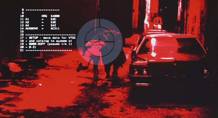 The idea to show the Terminator’s electronic point-of-view (POV) in certain shots can be traced back to Michael Crichton’s Westworld, which also showed the world through the android’s electronic eyes that allowed audiences to briefly identify with the creature; as well as Carpenter’s own POV shots of the killer Myers in Halloween.
