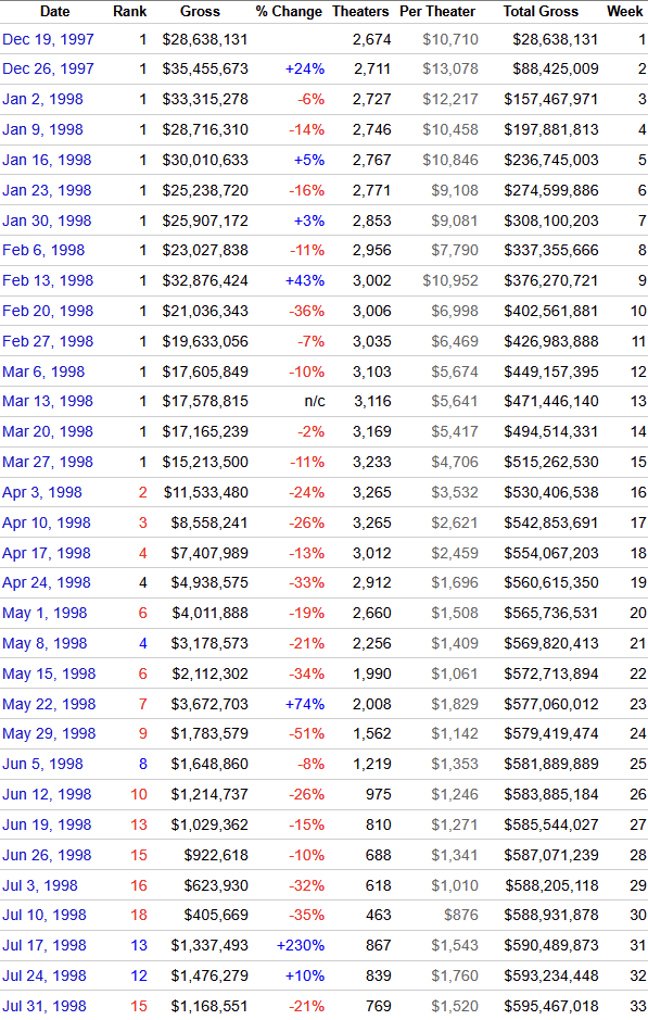 But then a funny thing happened. James Cameron’s films defy conventional wisdom— and this time, Titanic was about to defy expectations at the box office: on its second weekend, instead of dropping, the film made more money. When it did dip, it only dipped a little, and then would pick up again. In fact, on Valentine’s Day 1998, Titanic made $13 million in a single day. Titanic held the number-one spot at the box office for fifteen weeks— a record. When the film finally started to drop at the box office, it happened slowly instead of all at once.