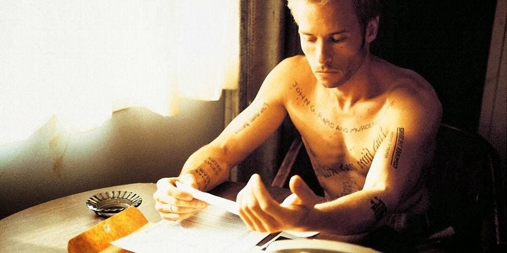 To help him understand how his protagonist— whom he’d named Leonard— saw the world, Nolan wrote the script from “totally” from his point of view7. “I would put myself in his position, and start examining and questioning my own process of memory, purely subjectively, and the choices you make about what to remember and what not to remember,” recalls Nolan. “Once you start doing that, it gets a little tricky. It’s a bit like with eyesight perception. Our eyes don’t see what you think they see. Only a small percentage of our eyesight is accurate, and memories are like that. The systems that Leonard employs were a very sincere and categorical response to ‘How do I live my life?’ I realized I always keep my house keys in the same pocket, and I never leave the house without them, and I check my pockets without even thinking about it. Leonard systematizes it. That’s very much the way the script was written, extrapolating from my own memory processes.”