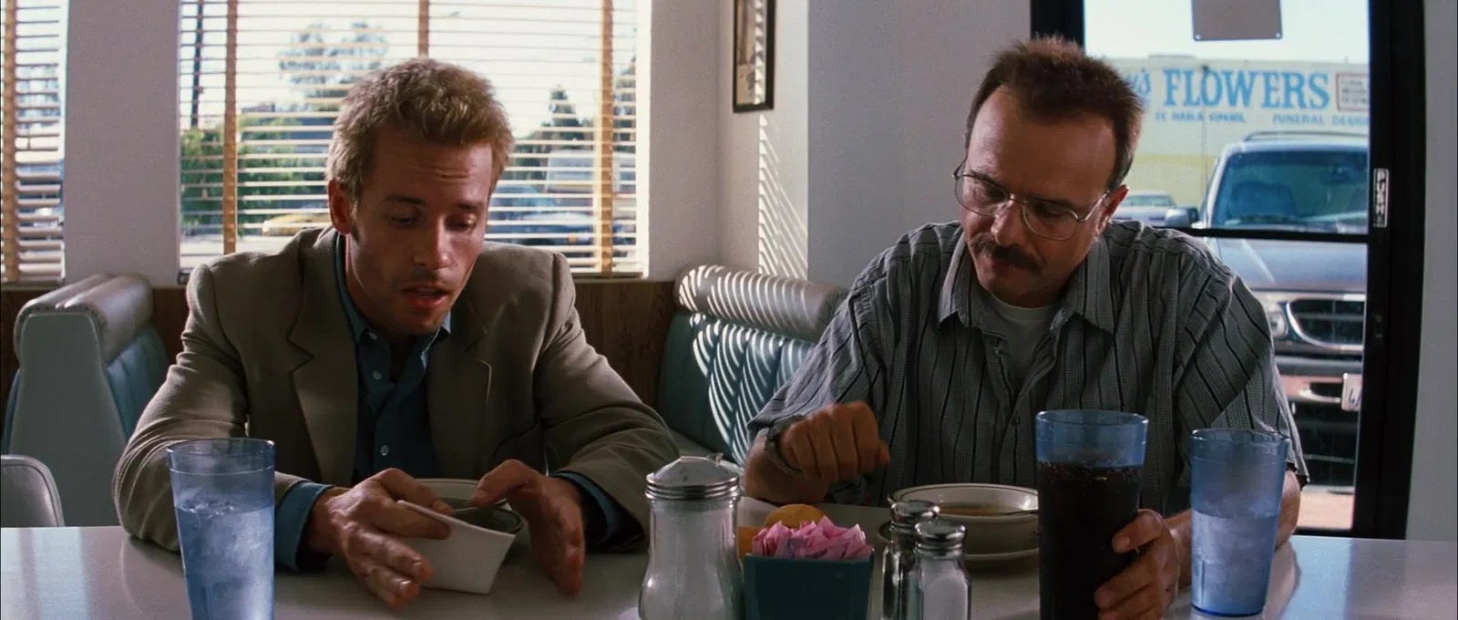 Armed with this insight and with a rough draft of his brother’s short story, Nolan got busy cracking on the script10. Whereas the protagonist in the story— named Earl— was confined to a hospital room, Nolan put Leonard on the outer limits of Los Angeles, making the character vulnerable for exploitation. When Teddy (Joe Pantoliano) first appears, he leads Leonard to the wrong car outside his motel as a joke.