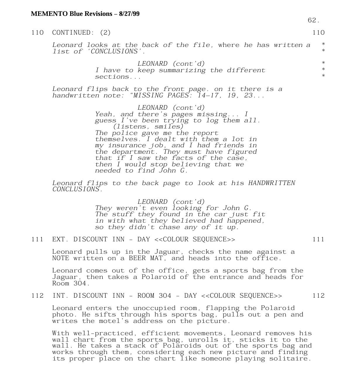 For instance, in the earliest iterations, Leonard stayed in two motels to make the cyclical nature of the story more explicit. Two motels became two rooms at the same motel; and two motel clerks became one, the character Burt.12 In the spring of 1998, Jonathan would move to Los Angeles and would provide the key to the ending, as Nolan recounts: