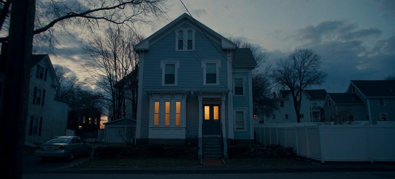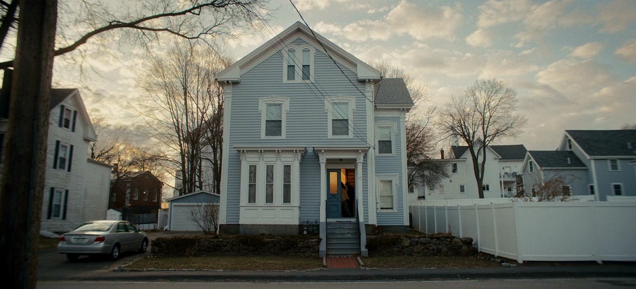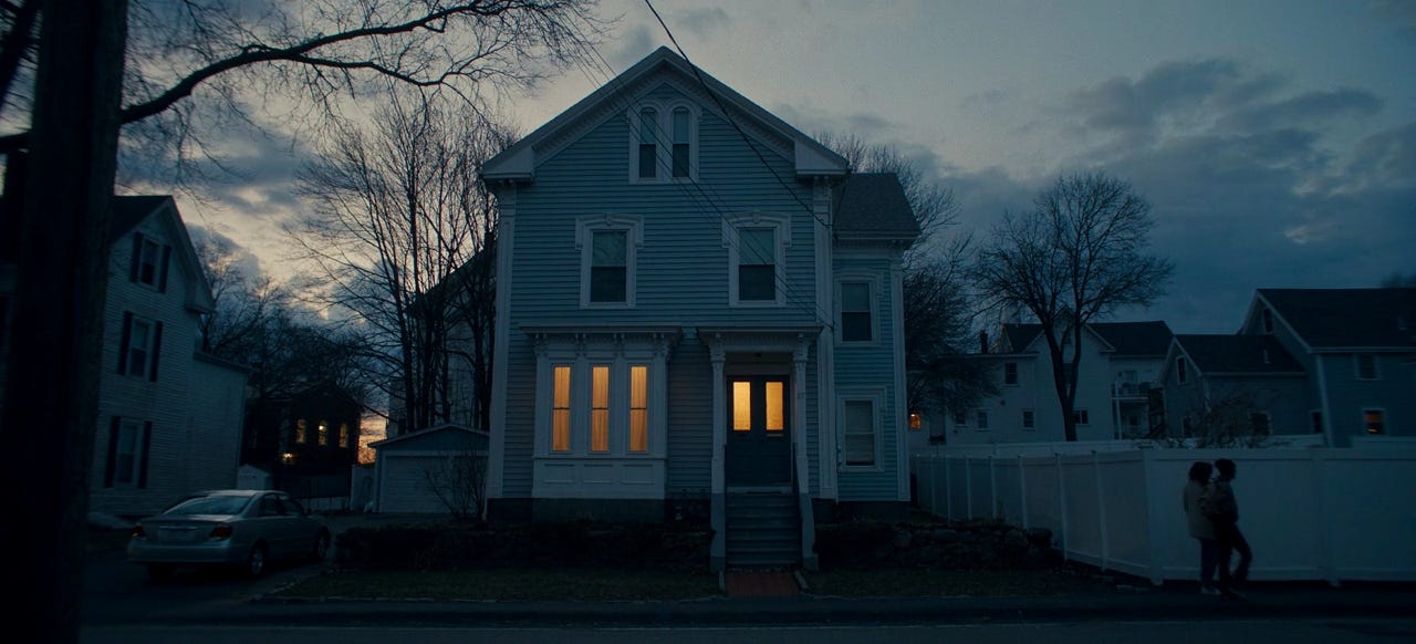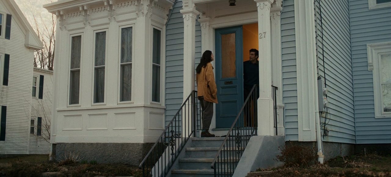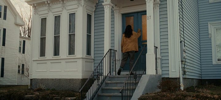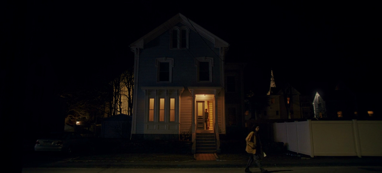 Suddenly, in the same scene, it cuts to a wide shot of the house from across the street.2 The house, which previously looked nice and unsuspecting, suddenly feels ominous. When Agnes enters, she’s dwarfed against the house, which looks almost as if it’s swallowing her up. The stationary camera only makes it worse, keeping its distance, forcing the viewer to look at it with no opportunity to look away. Agnes asks about her thesis, Drecker says he has it, and he closes the door. Except for another line later, that’s the last bit of dialogue we will hear for the next 4-5 minutes.