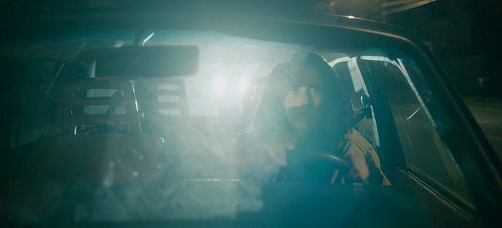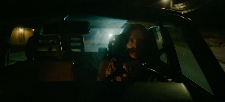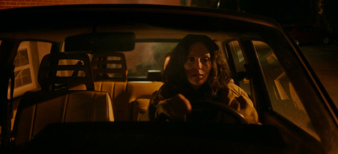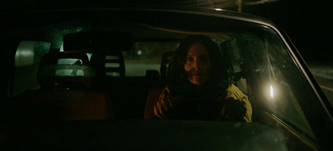 Now the film cuts to the next scene, which is another oner of Agnes driving home, shot through the windshield so we can see Agnes’s face, as she reverses, pulls out of the lot, and drives. And drives. And drives.