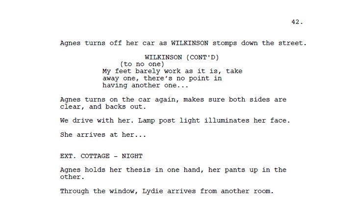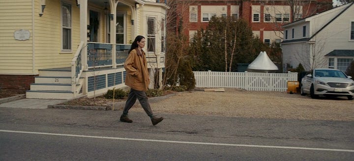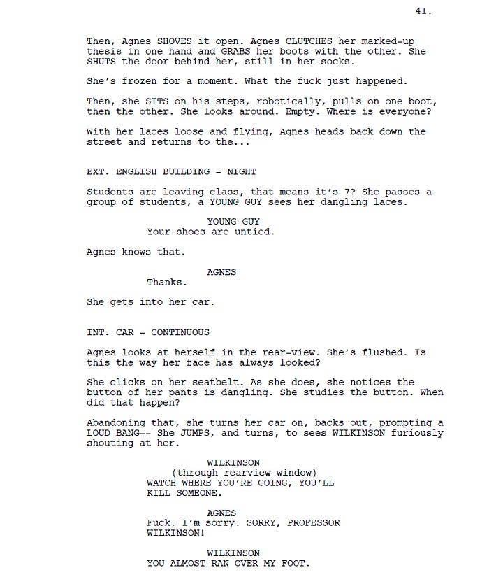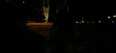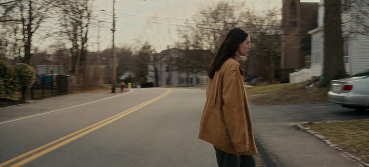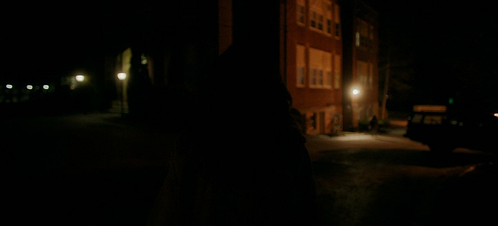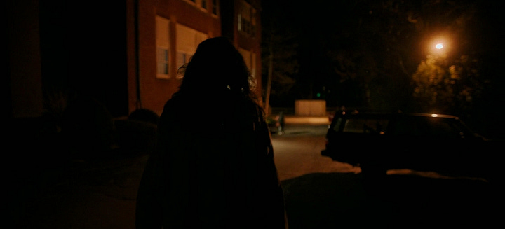 But somewhere between writing and filming, Victor wisely omitted the exchange between her and the faculty member after she leaves the house, and chooses to play the rest of the scene until she gets home in silence— except for one line from a student who comments about Agnes’ untied shoes. As a result, the tension actually BUILDS, because after having kept its distance for one-and-a-half minutes, Victor suddenly brings us back into Agnes’ orbit via an unbroken tracking shot from behind, following her as she turns off the street and cuts through a turn in the road that leads to the university parking lot.