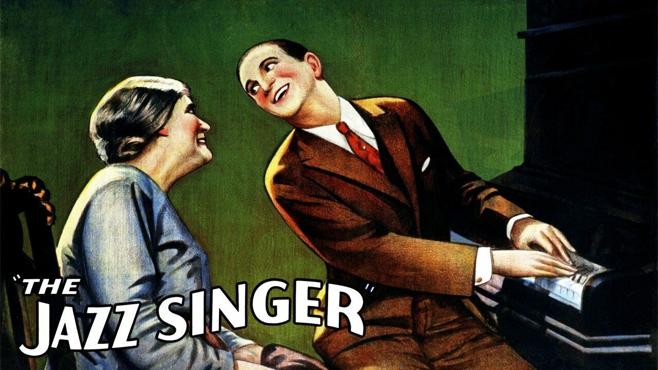 But Sam was undaunted. Warner Bros. was busy adding music to its new films; for the present time, Vitophone was used in shorts of popular entertainers that played in front of the feature films. A particular crowd-pleaser was the film The Better ‘Ole which featured Al Jolson singing in blackface6. The Lithuanian Jolson, born Asa Yoelson to a rabbi father, was known across the country for his renditions of ‘Swanee’ and ‘My Mammy,’ songs that were “performed with painted-on black skin and thick white lips.” One person particularly taken with Jolson was the playwright Samson Raphaelson, who wrote a short story about a Jewish singer rebelling against his cantor father to become a secular entertainer. In 1925, he turned it into a Broadway musical called The Jazz Singer.
